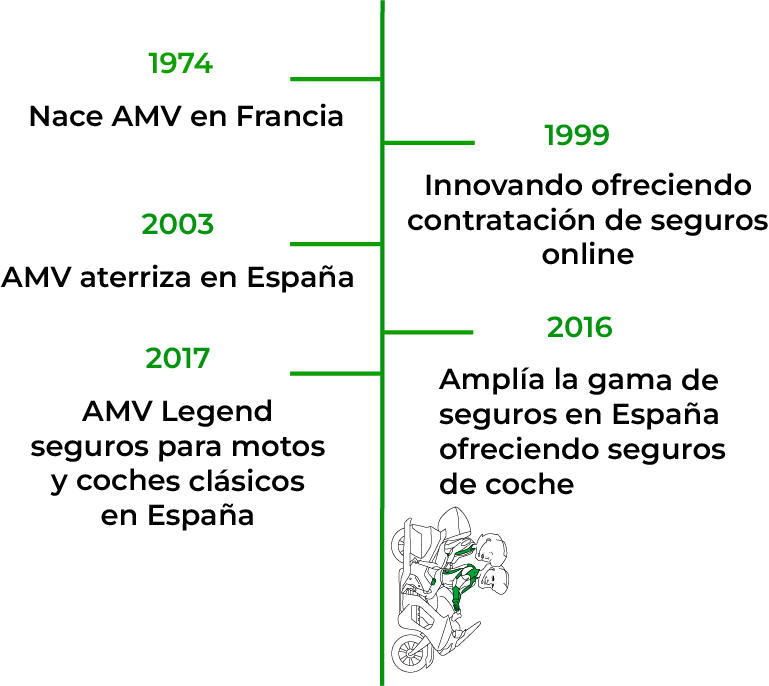 En 2003, AMV aterrizaría en España bajo la misma premisa, llevando así más de veinte años asegurando vehículos de dos ruedas, así como motos de agua y quads. Más adelante, incluiría seguros de coche y seguros de vehículos clásicos para seguir ofreciendo a sus clientes el mejor servicio con una oferta más completa.